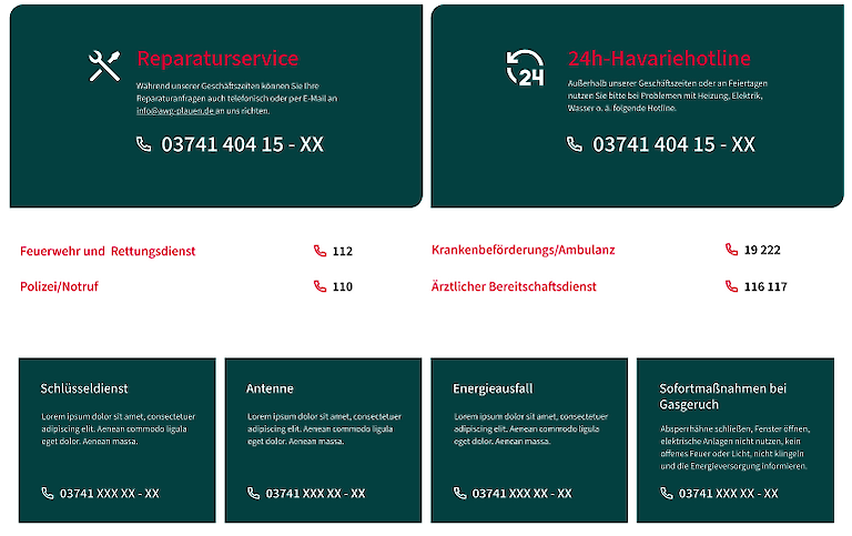 In dringenden Fällen außerhalb unserer Servicezeiten wenden Sie sich bitte an den zuständigen Notdienst. Besteht eine akute Gefahr, nutzen Sie bitte umgehend die entsprechenden Notrufnummern.